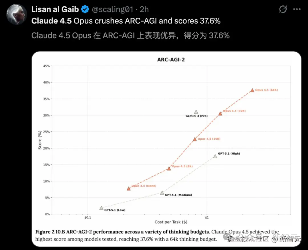 同时,在 ARC-AGI-2 评估中,Opus 4.5(64k)拿下了 37.6% 的高分。