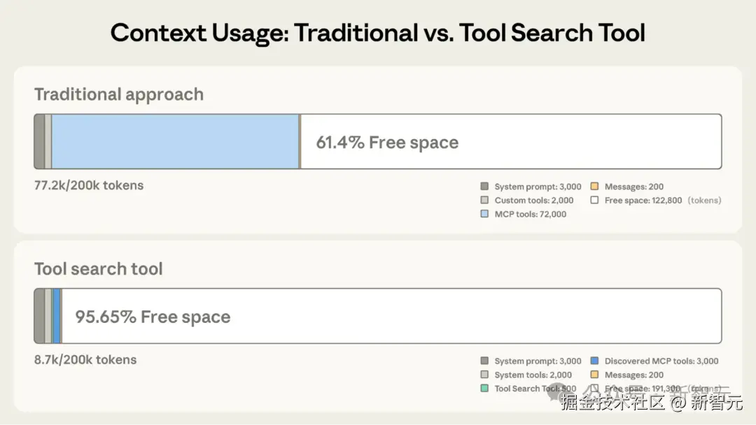 工具搜索工具保留了 191,300 Token 的上下文,而传统方法只有 122,800