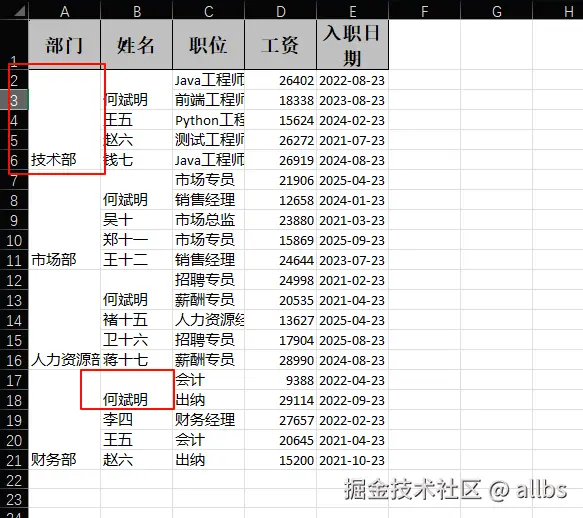 实际效果(数据并不合理,姓名一列专门设置了一样的名字用于测试合并):