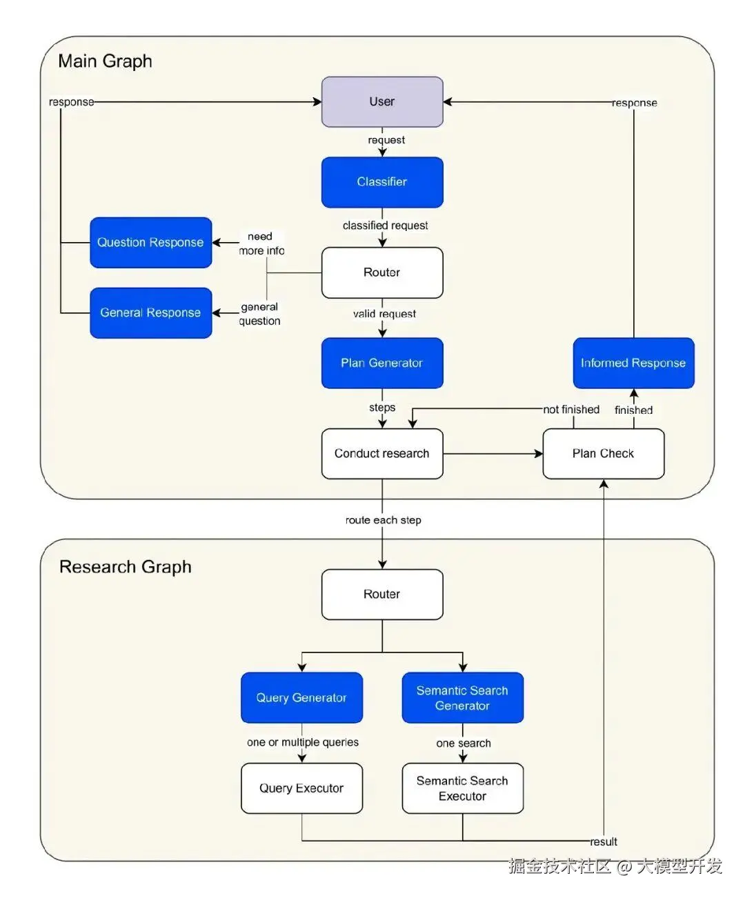 - 查询分析与路由:用户的请求首先被分析和分类,系统会根据查询将其路由到适当的工作流程节点。根据查询内容,系统可能进入下一步(生成研究计划)、提示用户提供更多信息,或者如果请求超出范围则立即回复。