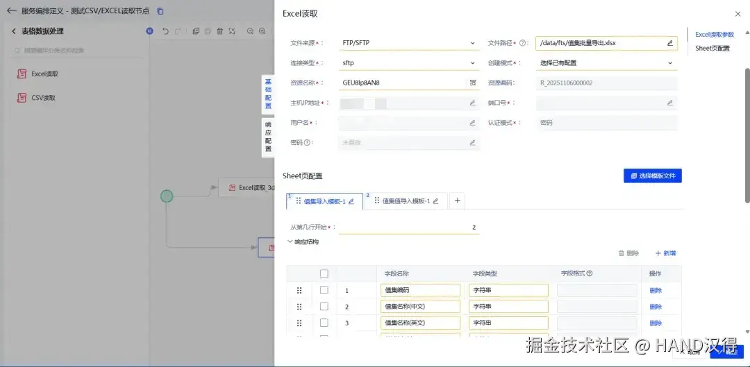 支持选择模板文件,将Excel列自动带出,提高编排效率;可以精确定义输出数据的结构,包括每个字段的名称、类型和格式;支持设置从表格的特定行开始读取,有效跳过表头等非数据行。