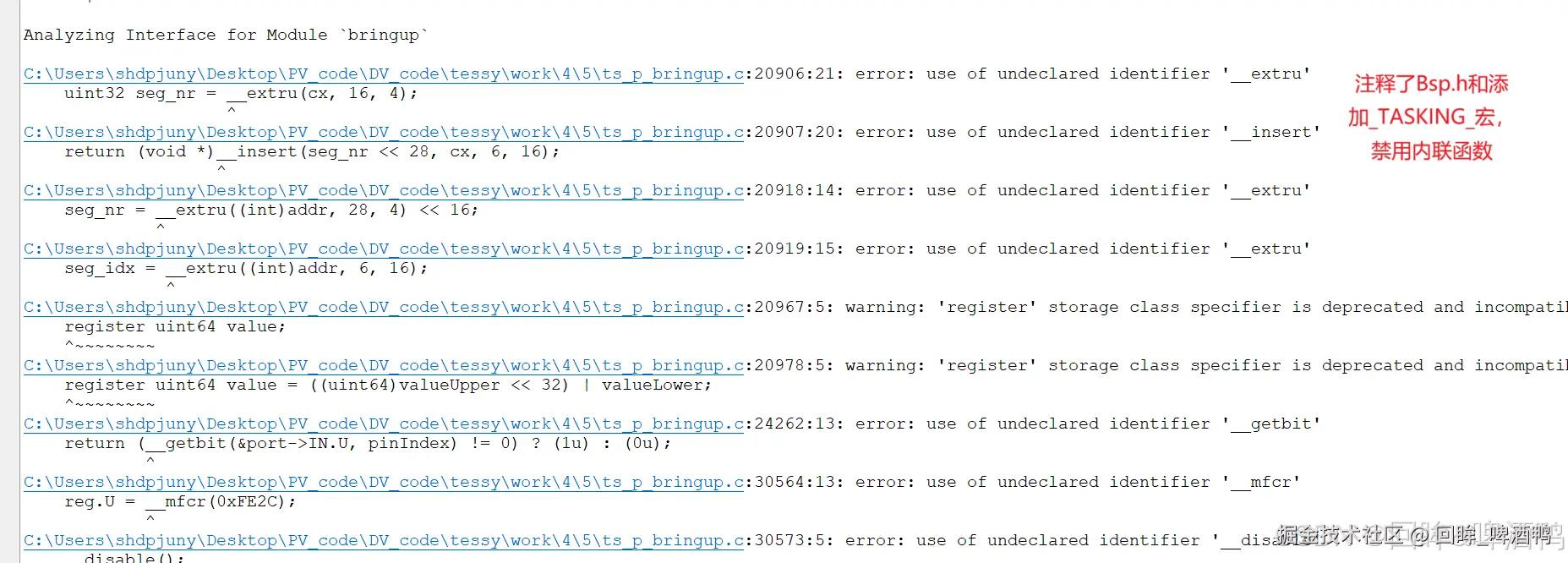 该错误主要是由一个很大的库文件引起的,暂时没有找到很好的解决方案,选择替代的方案就是注释Bsp.h(包含那个库文件的头文件),并且添加 _TASKING_的宏,在环境设置的地方禁用内联函数。