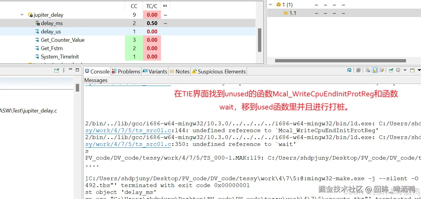 在TIE界面找到unused的函数Mcal_WriteCpuEndInitPortReg和函数wait,移到Used 函数部分并且进行打桩。需要注意的是,如果已经打了普通桩,还是报这个类似的错误,则需要取消普通桩,将普通桩改为高级桩。有些void函数必要时也可以打advanced桩(高级桩)