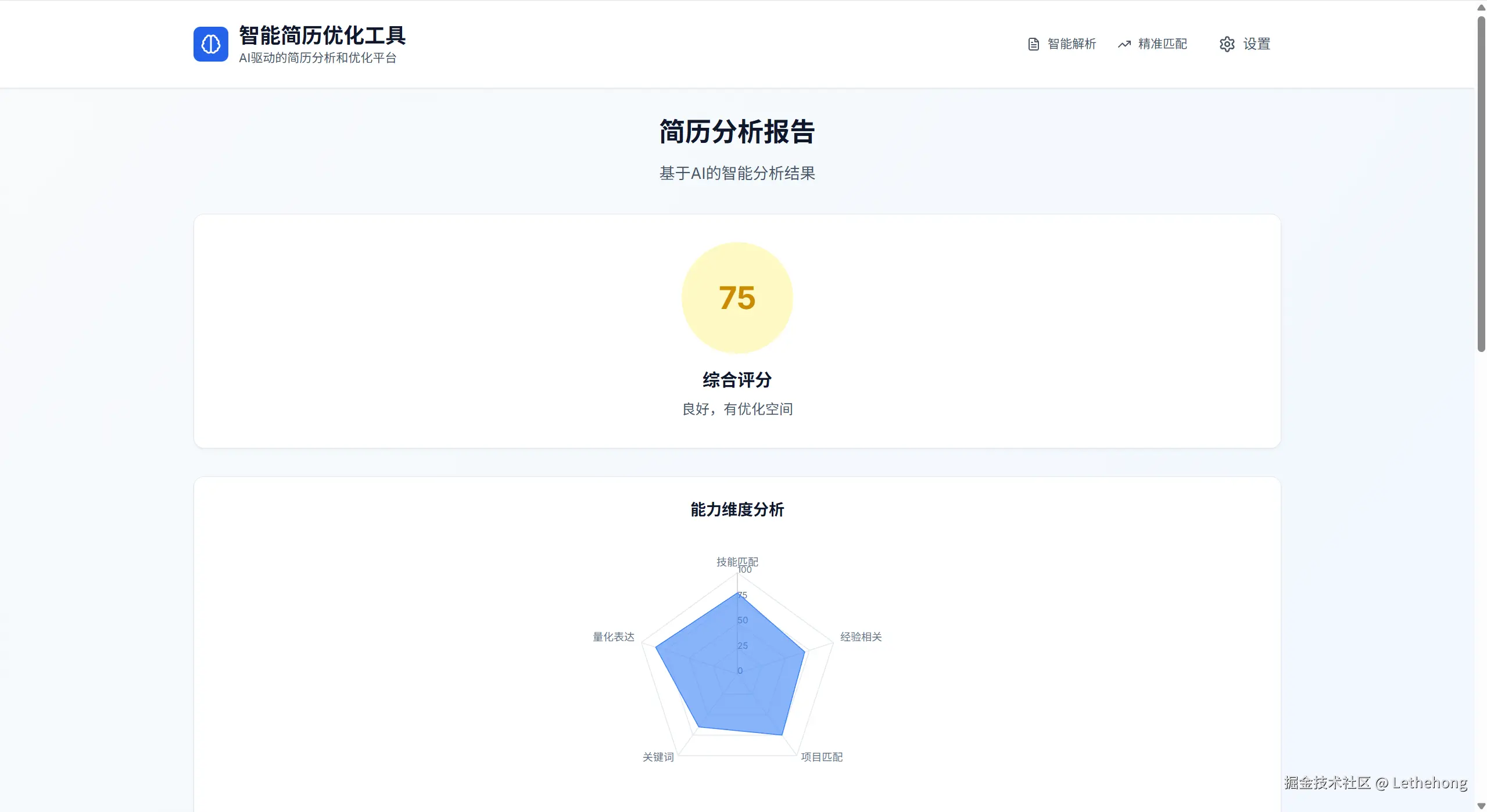功能概述: AI分析引擎是整个系统的核心与灵魂,负责对简历进行深度诊断,并给出具体的改进建议。该引擎基于K2 Thinking模型构建,利用其强大的语义理解和推理能力,从多个维度对简历进行全面评估。评估维度包括但不限于:简历内容的完整性、结构的清晰度、语言表达的规范性、技能与岗位的匹配度、项目成果的量化程度等。针对每个维度,系统都会给出具体的诊断意见和改进建议,并以百分制对简历整体质量进行评分。此外,AI分析引擎还能生成可视化的分析报告,如雷达图,帮助用户直观了解简历的优劣势。