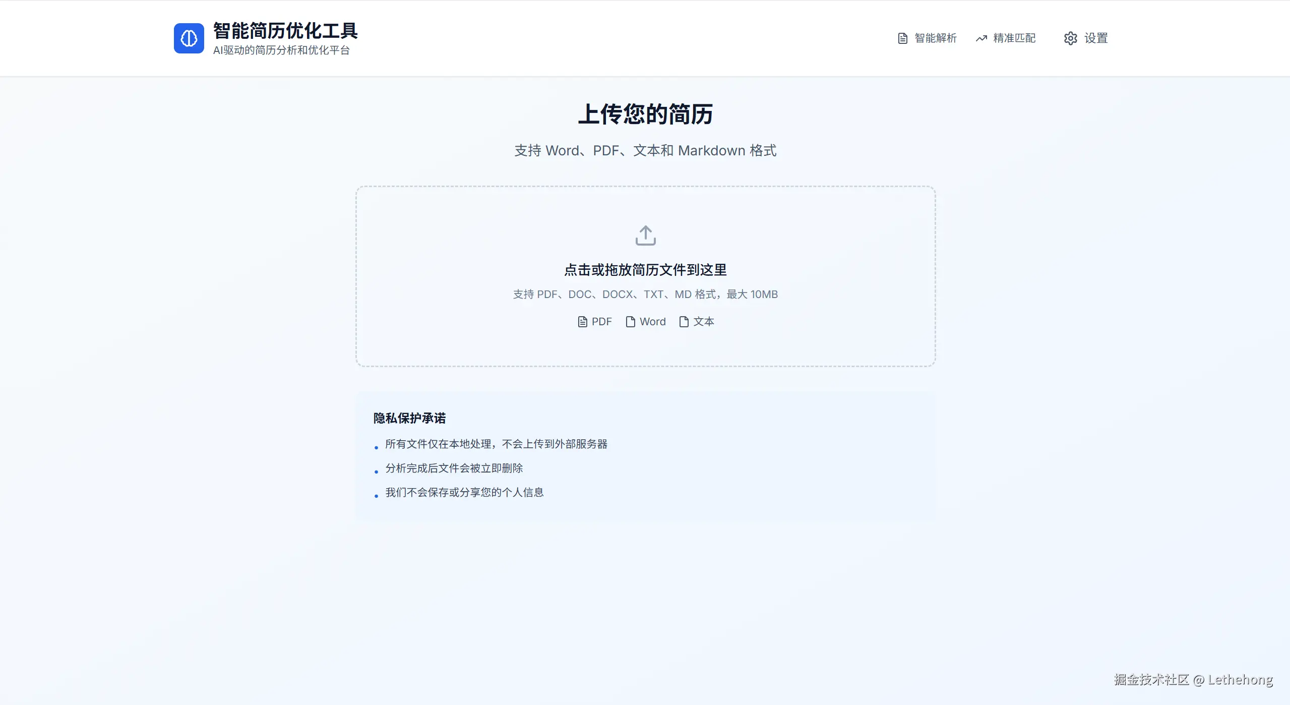 1. 文件上传:支持Word/PDF/文本格式简历上传