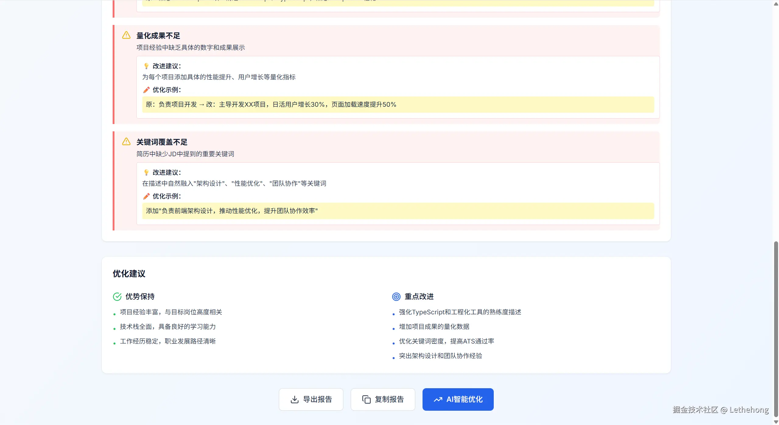 技术实现: 一键优化功能的实现依赖于K2 Thinking模型的强大文本生成和编辑能力。其核心思路是让模型根据AI分析报告中的建议,对简历原文进行重写。