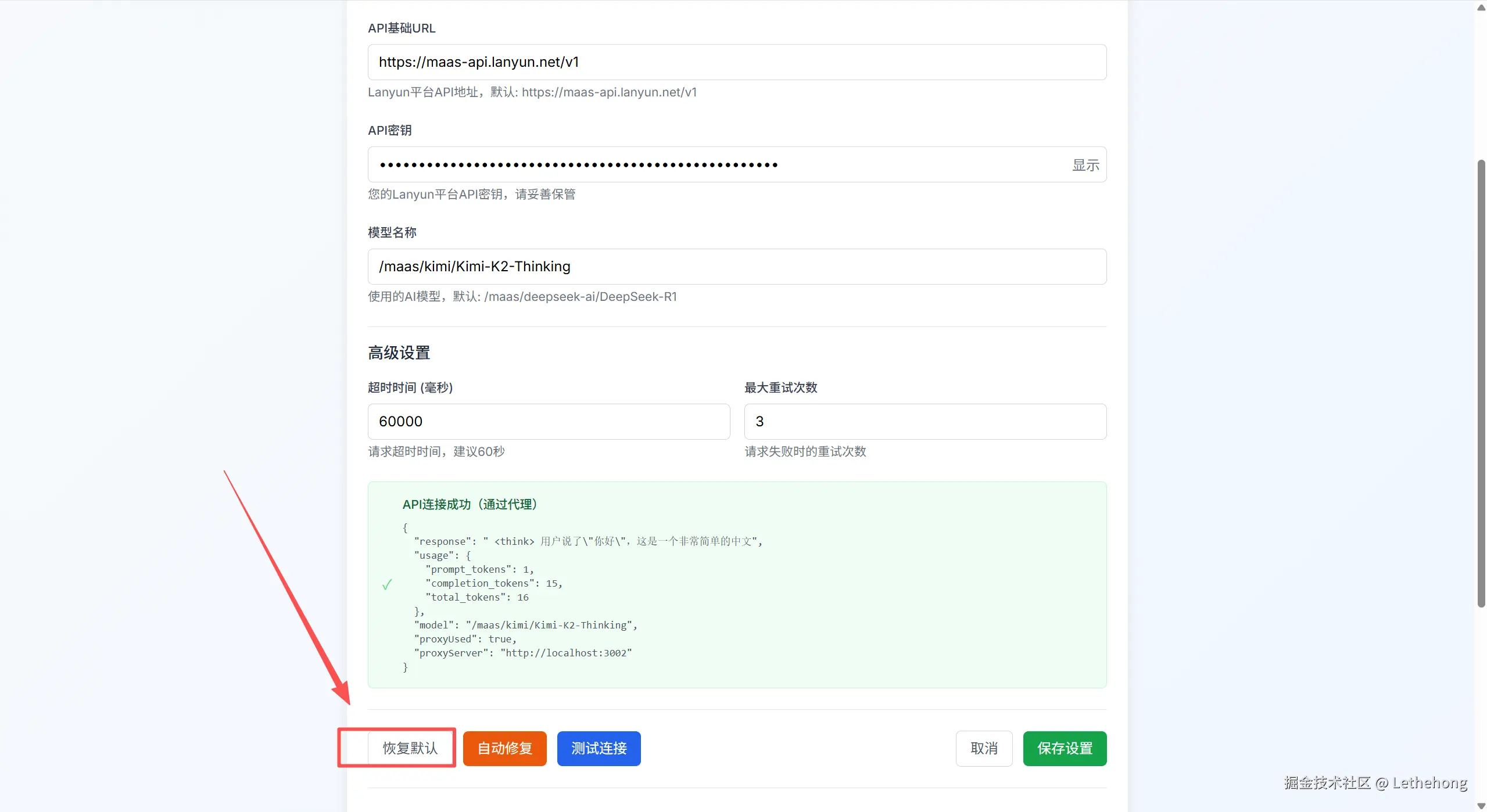 现在回到web界面查看,这里我配置的模型是/maas/kimi/Kimi-K2-Thinking,可以很清楚的看到已经验证通过了