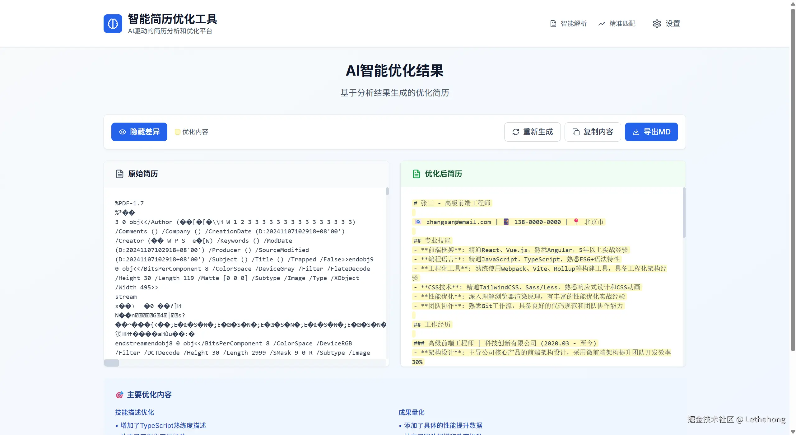 功能概述: “一键优化”功能是系统的一大亮点,它允许用户在获得AI分析报告后,一键让系统自动重写简历,生成一份优化后的版本。优化后的简历将根据AI的建议进行修改,包括调整结构、润色语言、补充量化成果、突出与岗位匹配的关键词等。为了帮助用户了解优化过程和结果,系统采用左右分栏的对比展示方式,左侧显示原始简历内容,右侧显示优化后的内容,并用高亮标注出具体的改动点。这种直观的对比方式,让用户可以清晰地看到每一处修改及其原因,从而在必要时进行人工调整。