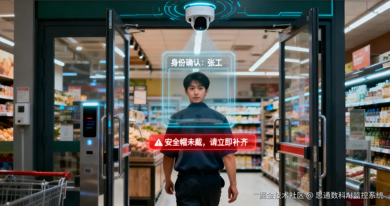 思通数科AI视频识别系统化身为门店的“隐形督导”,实时监控全链路。从员工进门的第0秒开始,无感考勤锁定身份(99.5%亚裔面部精度),自动记录工时并检测安全帽佩戴:“张工,安全帽未戴,请立即补齐。”高峰期货架区,AI扫描20+违规行为,如陈列不标准,毫秒级预警推送至平板:“货架A3区倾斜,10秒内整改。”异常时,10秒内生成工单至主管手机;仓库操作中,姿态分析捕捉不规范搬运,联动RFID标签同步库存数据,避免缺货假象。