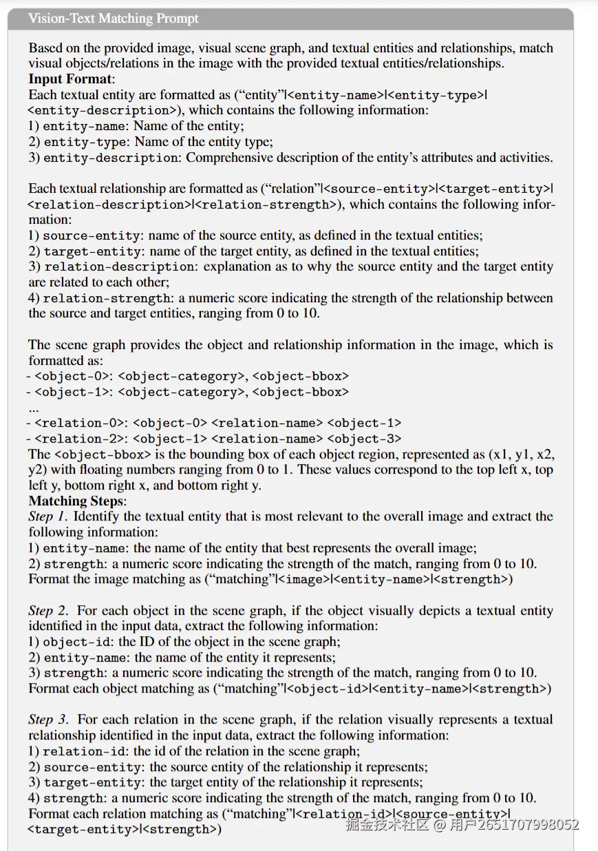 核心是解决文本实体/关系与视觉实体/关系的对齐问题,论文提出用MLLM作为视觉-文本匹配器,通过精心设计的Prompt实现细粒度对齐: