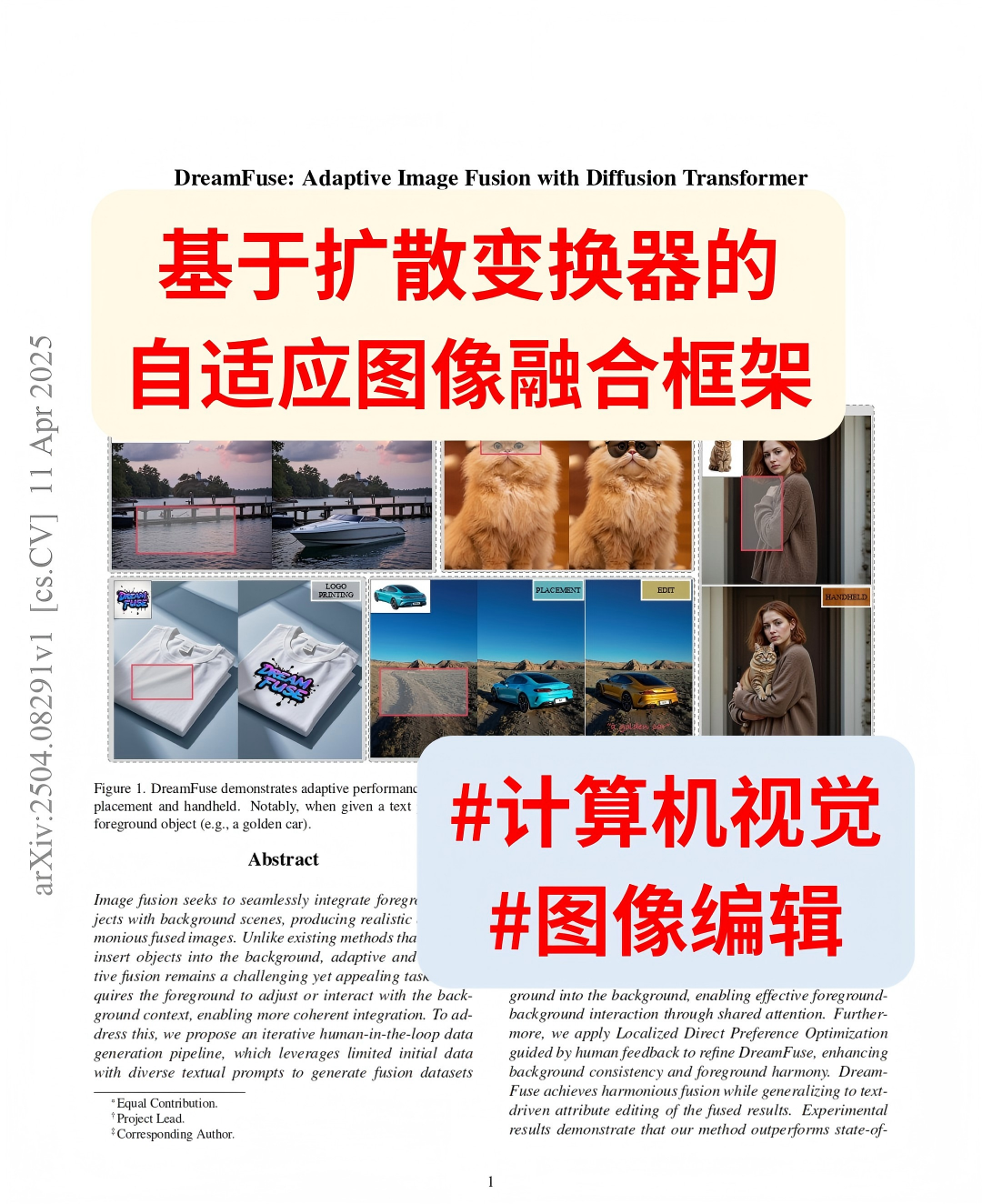 图像融合旨在将多源图像的关键信息融合成单一的、信息更丰富的图像,是计算机视觉中的一项基础而重要的任务。传统方法往往受限于固定的融合规则,容易产生伪影或丢失细节。为了突破这些瓶颈,"DreamFuse" 论文提出了一种基于生成式模型的全新图像融合框架。