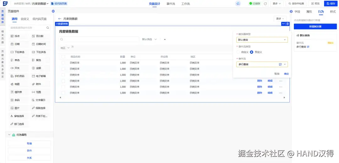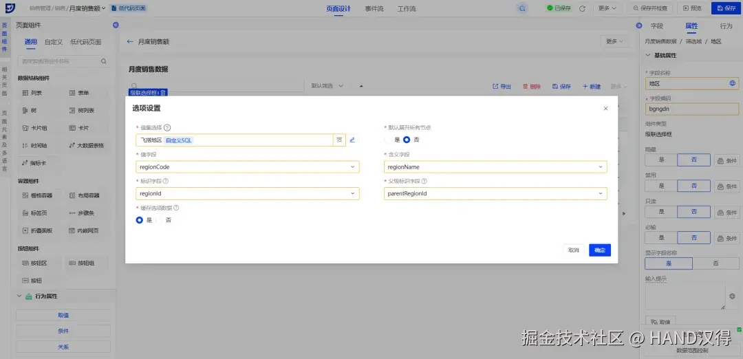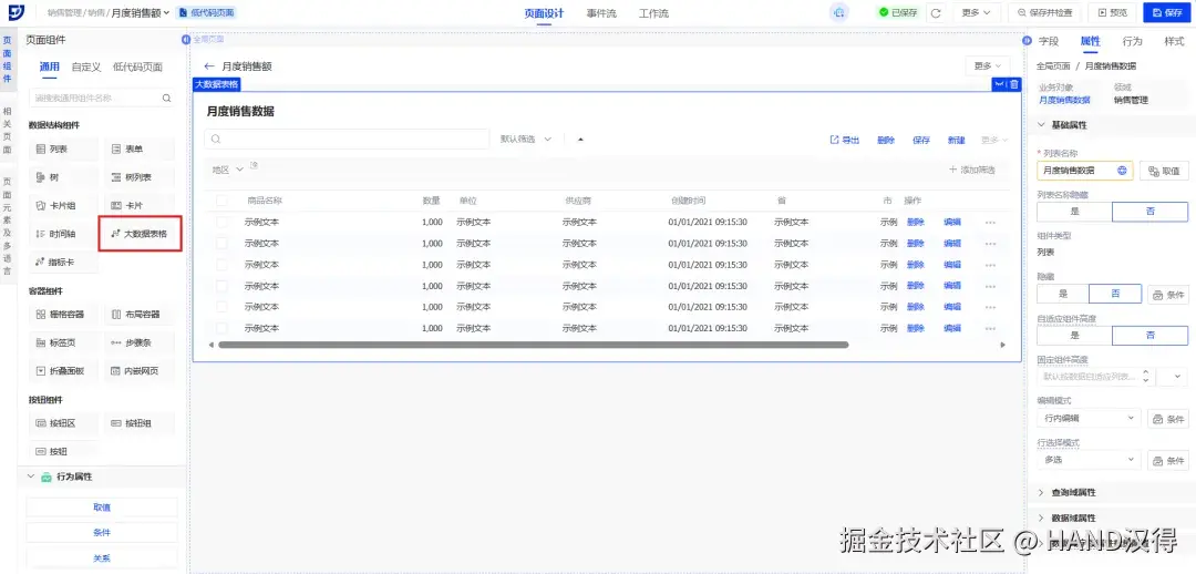 通过以上步骤,我们开发出大数据表格结构组件和级联选择基础组件,接下来让我们看看在画布中的使用效果吧!
