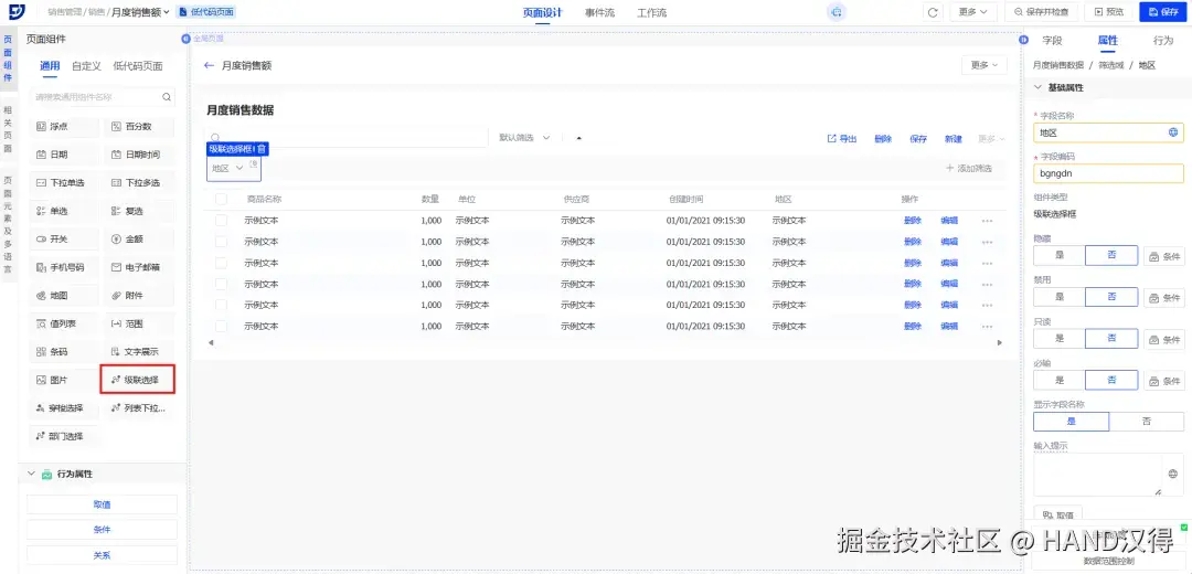 企业销售部门的月度销售数据表,涵盖全国各区域、各产品线的销售额、销量、客单价等数据(可能达数十万条),此场景下,标准组件可能无法满足个性化需求,例如使用大数据表格来展示海量数据,依赖级联选择组件实现省市区多级联动筛选,面对此类定制化需求,扩展组件的开发与集成便成为提升系统能力的关键路径。