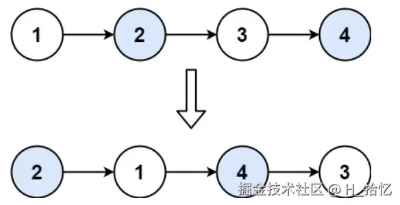 给定一个链表,两两交换其中相邻的节点,并返回交换后的链表。