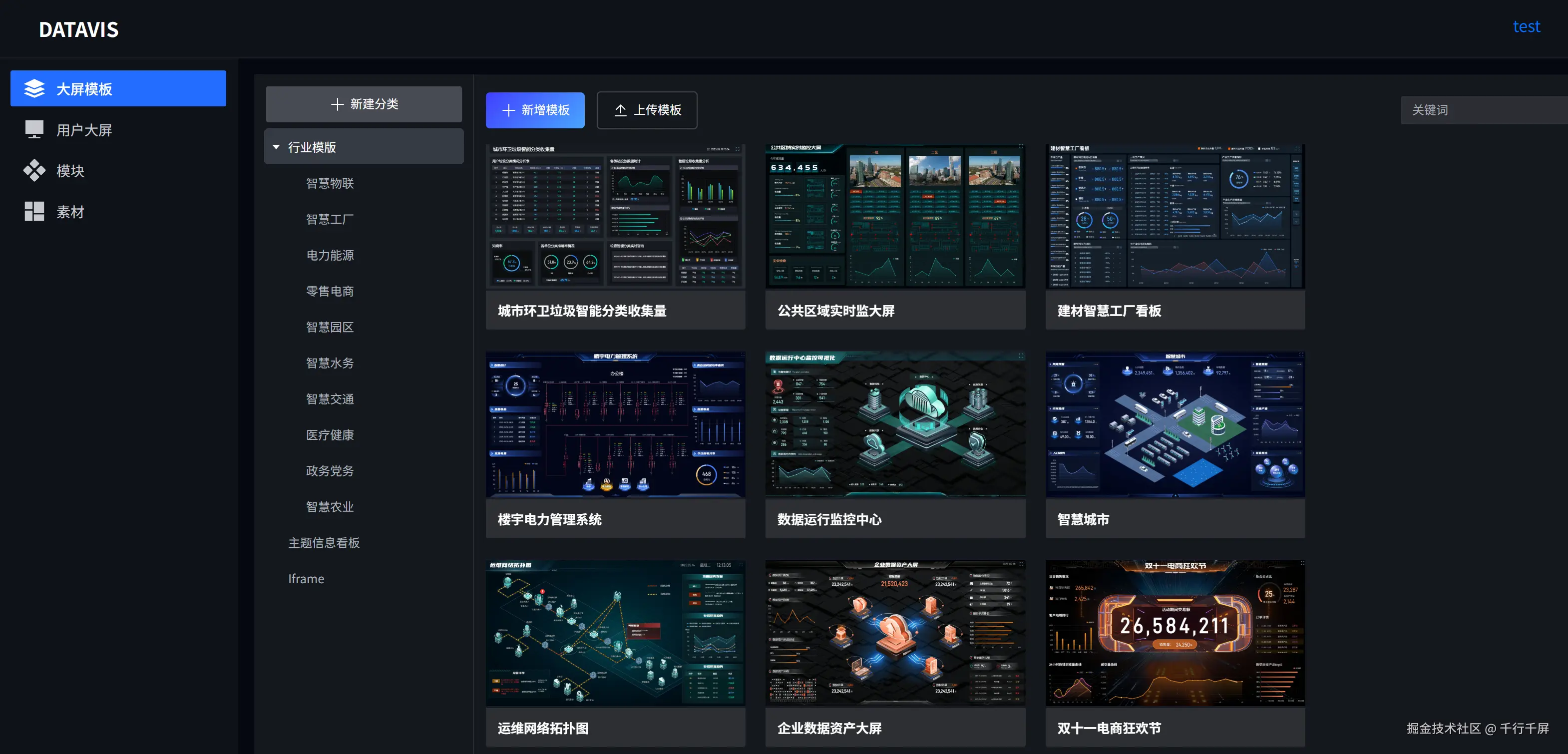 以“千行千屏”为代表的低代码平台,通过拖拽组件、绑定数据源即可快速生成大屏(如图1)。其核心价值在于: