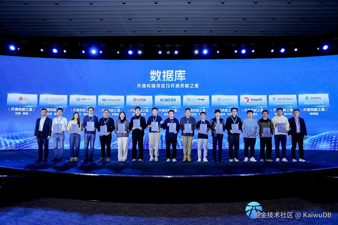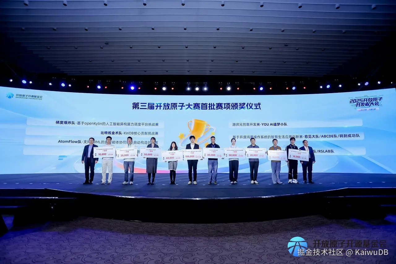 11 月 21 日,2025 开放原子开发者大会开幕式上,KWDB 凭借技术创新力与广泛的社区影响力荣获数据库领域“开源先锋项目”,KWDB 社区 TOC 成员窦志彤荣获“开源贡献之星”并受邀参与论坛分享,“KWDB 核心贡献挑战赛”一等奖获奖团队受邀参与第三届开放原子大赛首批赛项颁奖仪式。