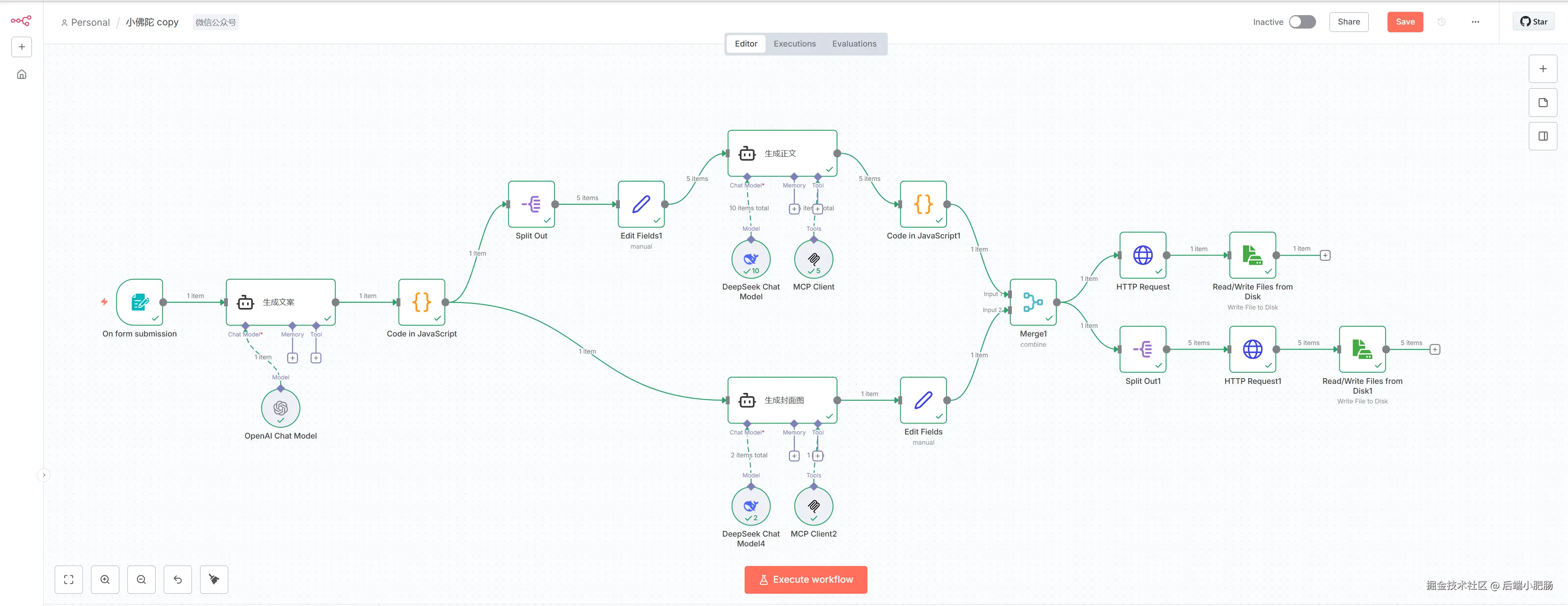 写入正文同理,这不再赘述。以上就是整个工作流的完整流程拆解,动手能力强的读者可以跟着教程实践一遍。上述工作流已经被收录到了小肥肠共学社群中,如果想直接获取工作流原件,可以加入社群后我拉你进空间直接学习使用。