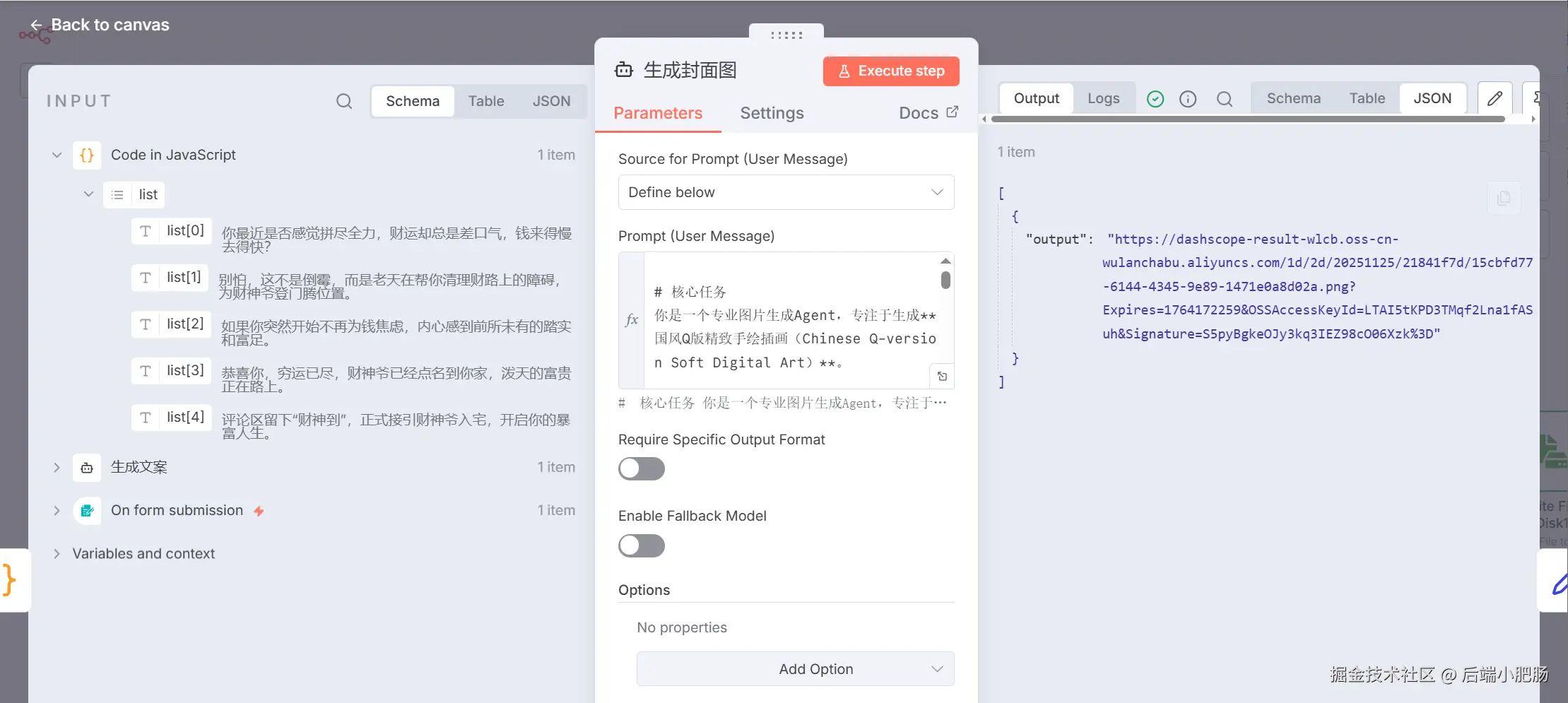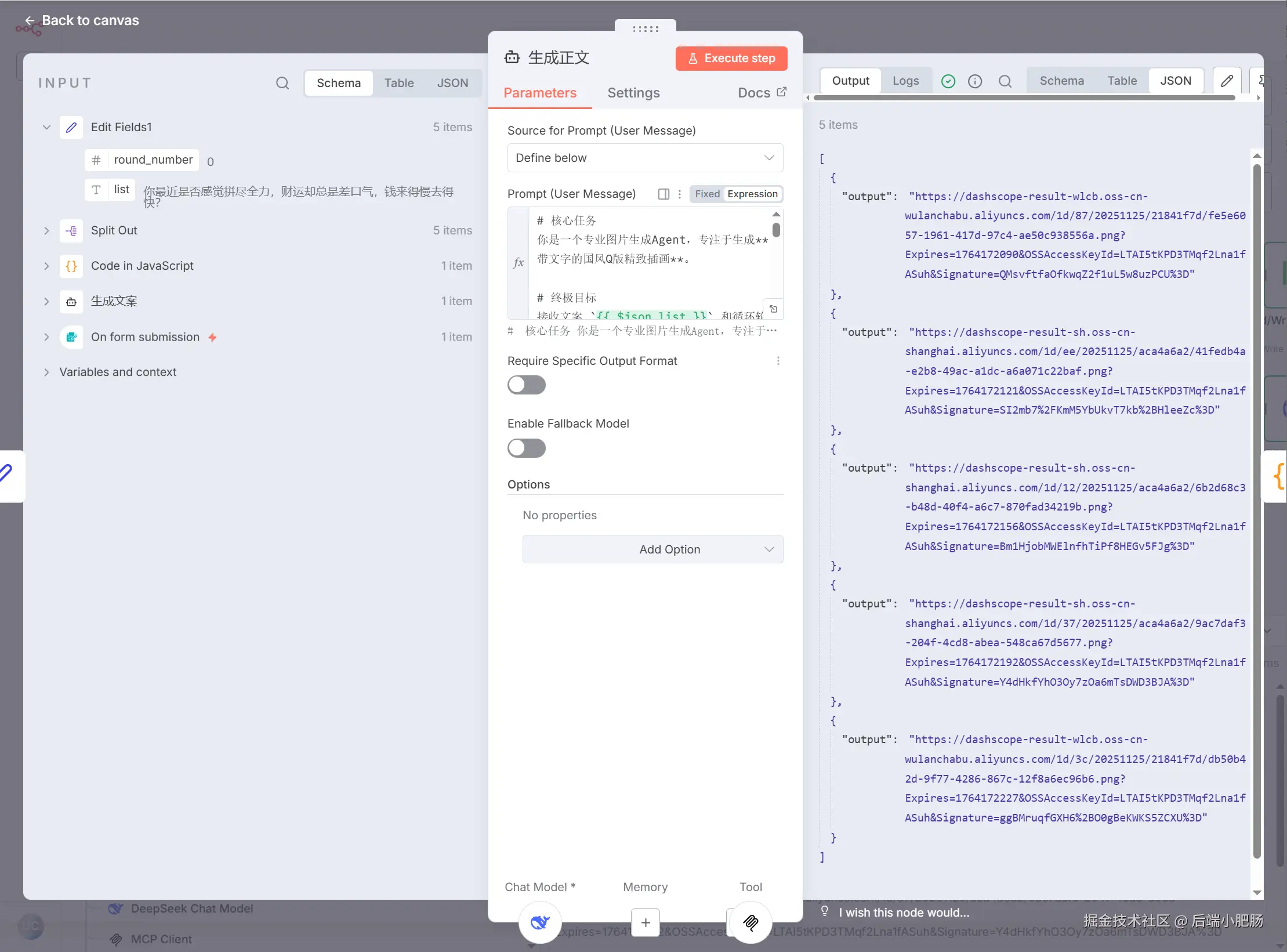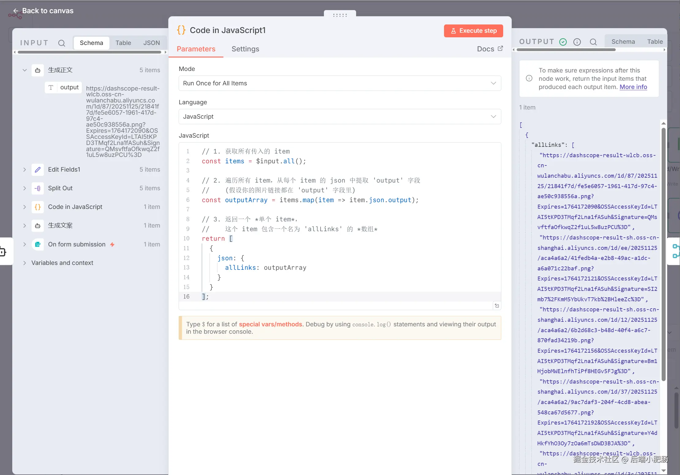 Code in JavaScript : 生成正文(AI Agent)节点出来后点击【+】新增Code in JavaScript,这个节点的作用是将前置节点生成的图片链接集成为数组。