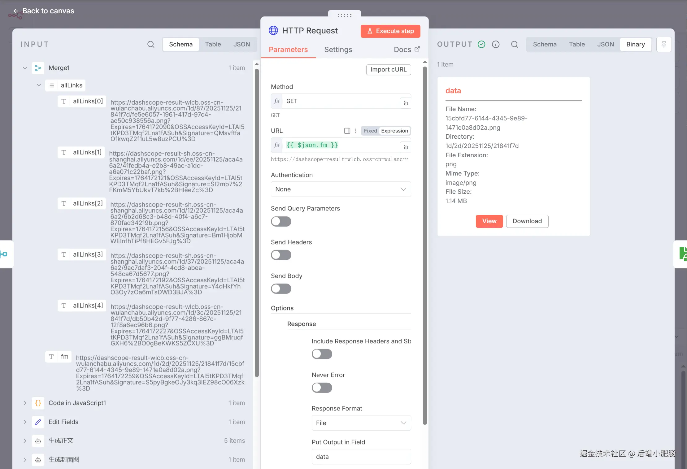HTTP Request(写封面):Merge出来后点击【+】添加HTTP Request节点。这个节点的作用是将图片链接转换为文件。