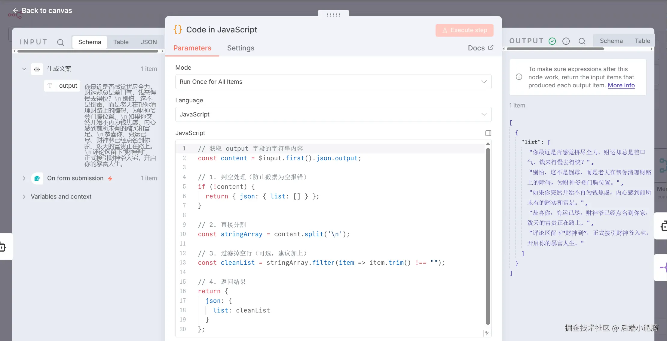 Code in JavaScript:生成文案(AI Agent)节点出来后点击【+】新增Code in JavaScript节点。这个节点的作用是将前置节点输出的文案基于\n分割为文案列表。