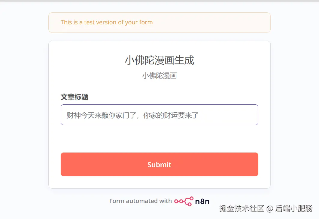 大家好,我是小肥肠!今天带来 n8n硬核新实战: 只需提交标题,AI 包办文案生图,几分钟后,神韵十足的小佛陀漫画一键写入你的本地磁盘!