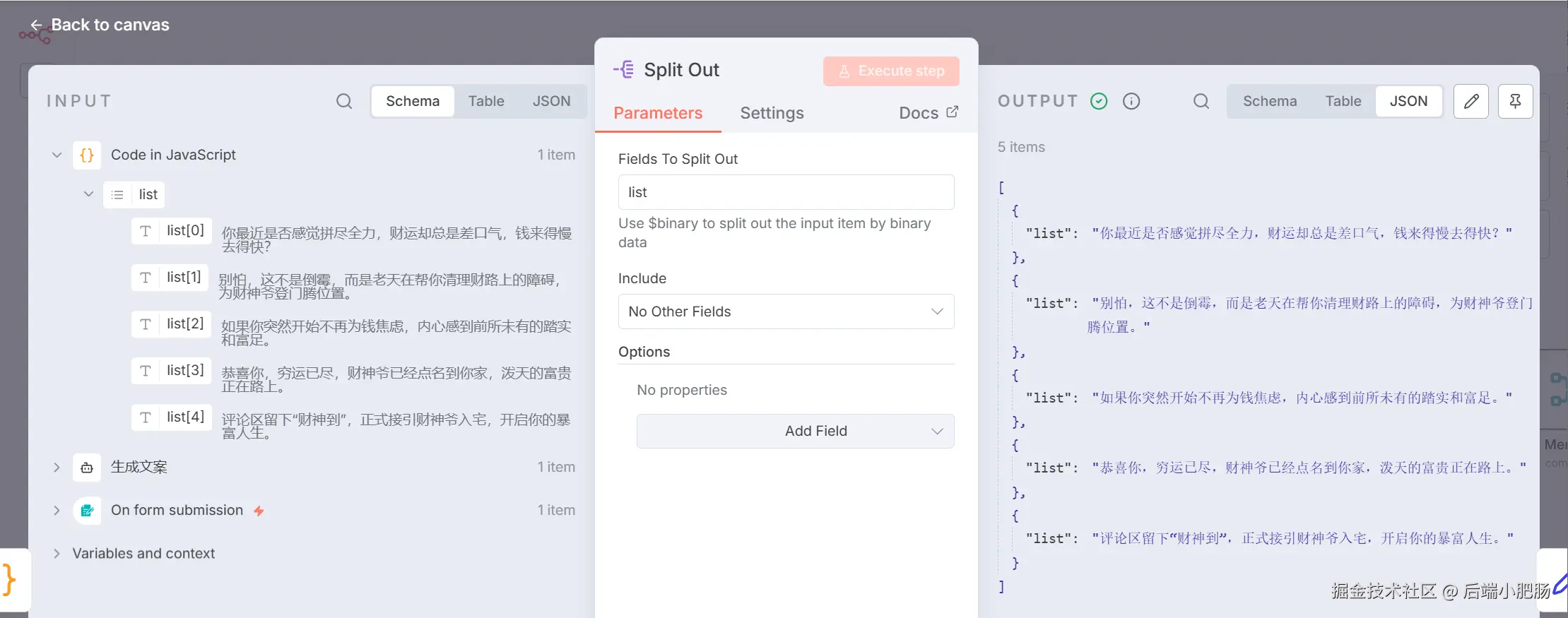 Split Out:Code in JavaScript节点出来后点击【+】新增Split Out节点。这个节点的作用是拆分遍历前置节点生成的文案列表。
