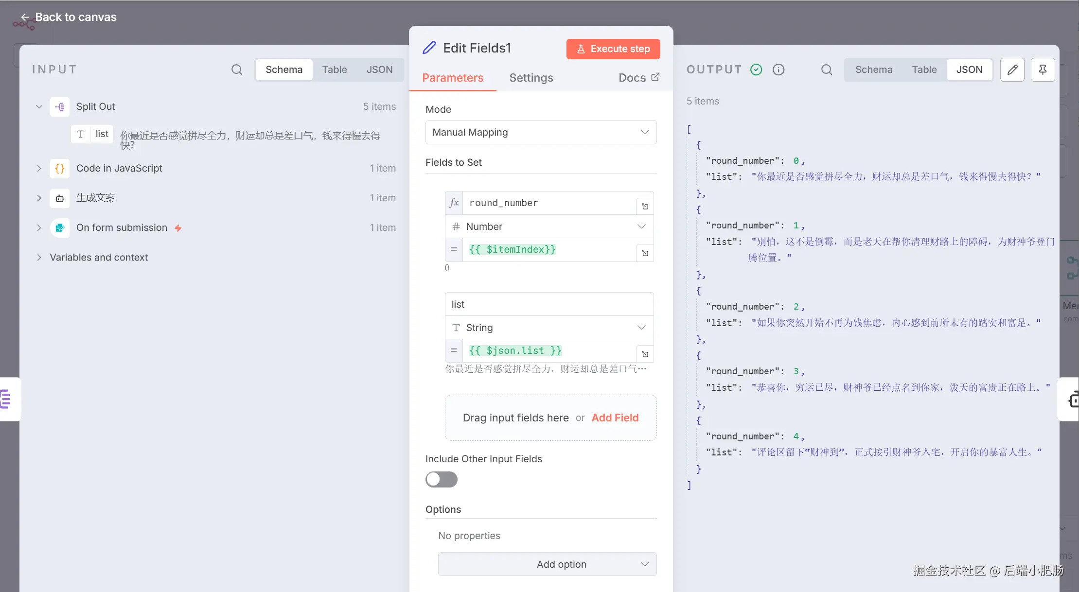 Edit Fields:Split Out节点出来后点击【+】新增Edit Fields节点,这个节点的作用是记录循环轮数以及取出前置节点生成的文案内容。