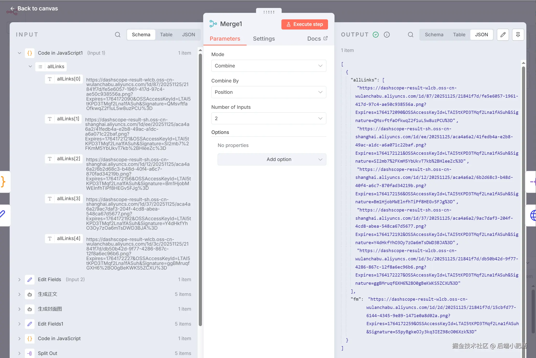 Merge:Code in JavaScript和Edit Fields节点出来后点击新增Merge节点,集成前置节点生成的封面图和正文漫画等元素。
