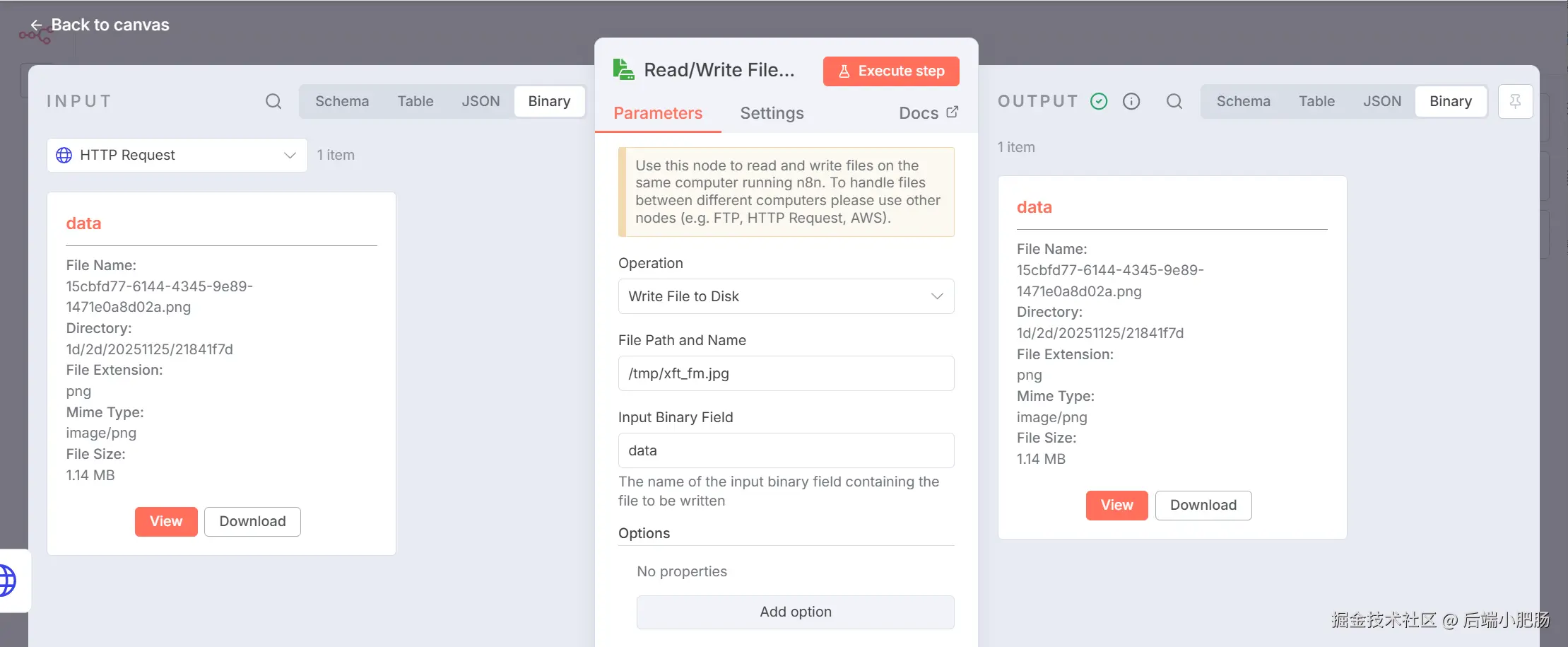 Read/Write Files from Disk(写封面) :HTTP Request节点出来后点击【+】新增Read/Write Files from Disk节点,这个节点的作用是前置节点的文件下载到本地磁盘。
