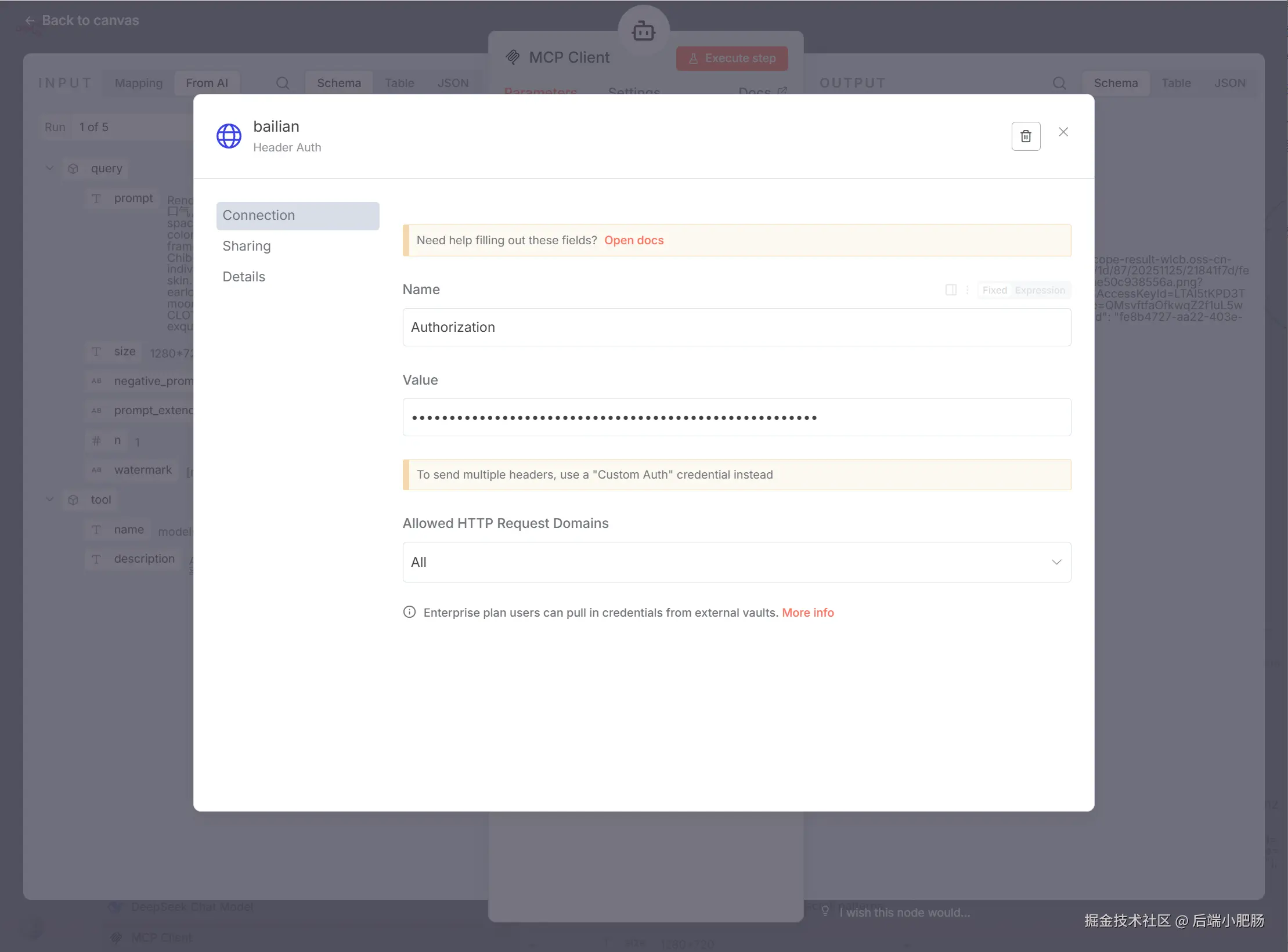 Credential for Header Auth点击Create new credential,Name填写Authorization,Value填写阿里云百炼的key,注意key前面需要加Bearer和一个英文空格。最后把这个Auth命名为bailian,以便后续节点使用。