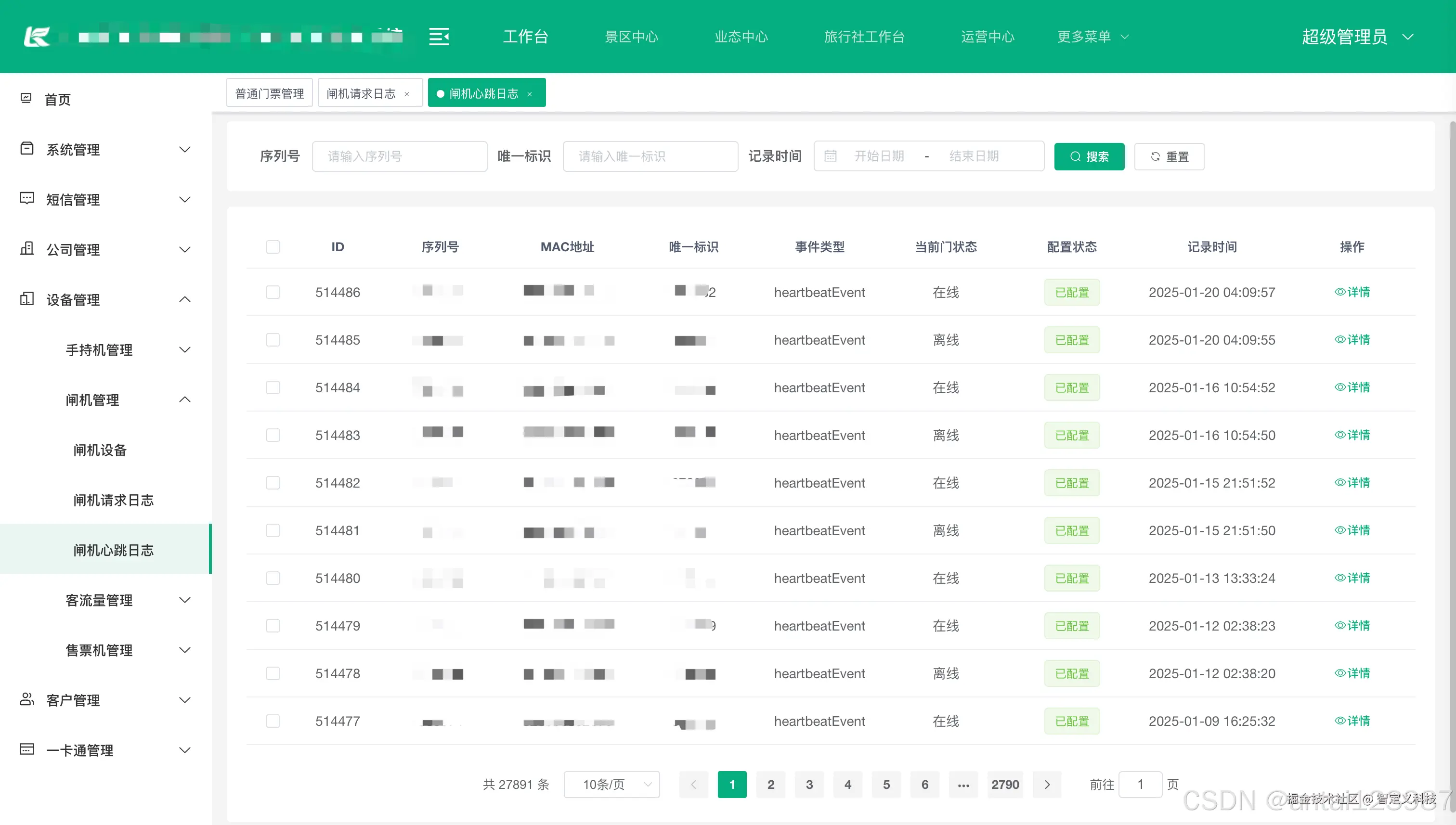 | 设备心跳日志 | 闸机设备实时情况日志 | |