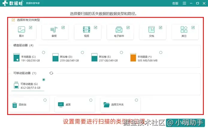 数据恢复免费软件有哪些?这款优加蛙恢复大师能够给予用户不小的自由度,我们可以通过该软件,将扫描准备进行分区块选择。在该数据恢复软件免费版中,我们可以选择丢失文件的类型,选择丢失文件的位置,还可以选择需要的扫描模式。它支持的文件类型相当丰富,不论大家常用的音频、图片、视频、文档、电子邮件,我们还能进行上百种文件类型进行扫描恢复。