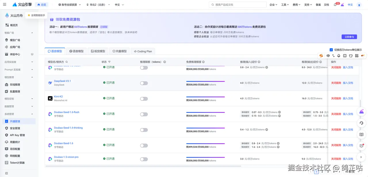 在大模型参数选择这块,本demo选择的是doubao-1-5-pro-32k-250115,所以我们需要先开通模型服务:【点击进入】(我这里经常使用各种模型所以全部都开通了,大家可以根据需求来进行开通)