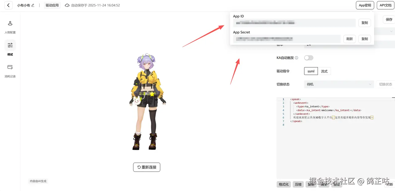 - 当人物配置全部选取完毕,大家可以进入调试页面发起连接测试,确认数字人的形象是否符合预期。