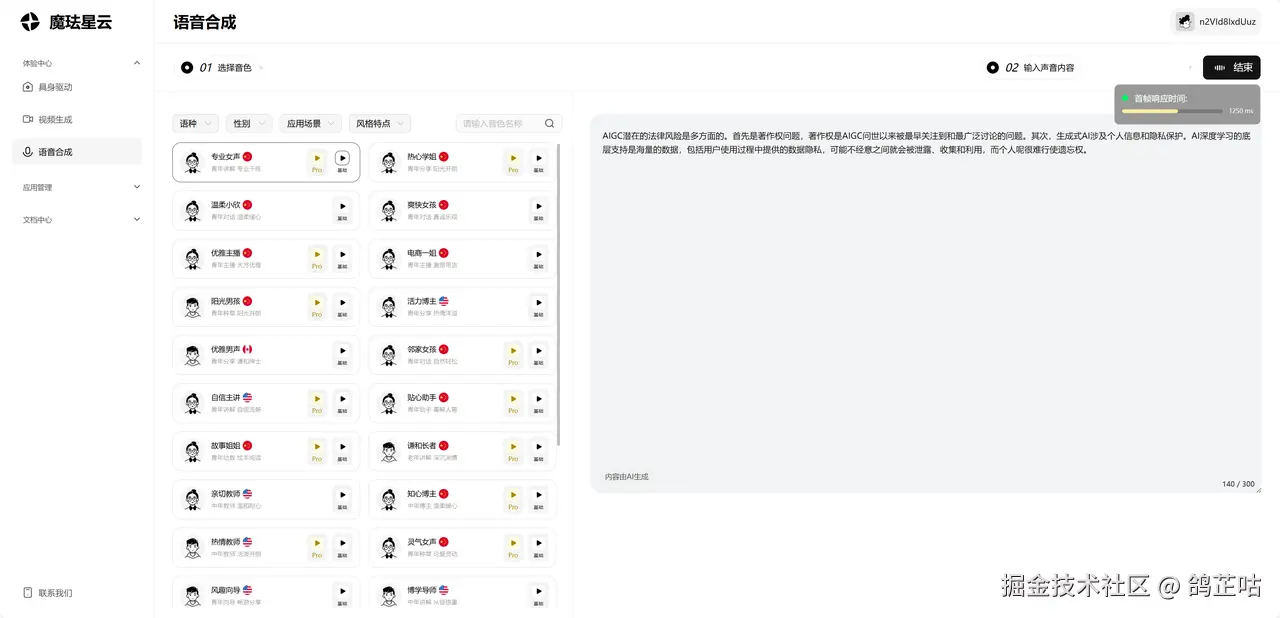 - 低延时(可随时打断) :在语言生成这块魔珐星云采用了高自然度 TTS 语音合成,小模型延迟约 100ms,大模型约 500ms;支持多语言、多音色,适配多样化场景需求。数字人能实时接你每一句话,还支持 “中途打断”—— 就跟和真人聊天一样,你随时能插新问题,数字人会立刻换话题,完全没有传统 AI 那种 “机械感”。