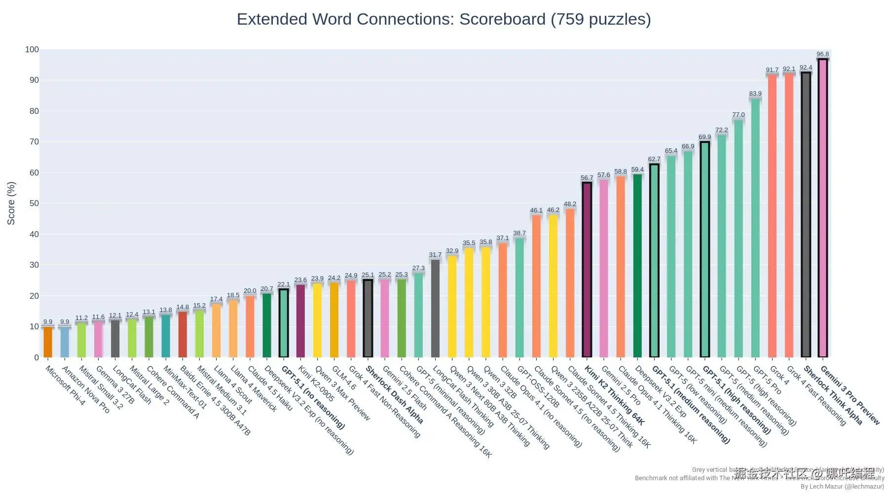 在专门考察AI在复杂情境下的逻辑推理和联想能力的“扩展词语关联(Extended Word Connections)”排行榜中,Gemini 3 Pro 的表现堪称“独孤求败”: