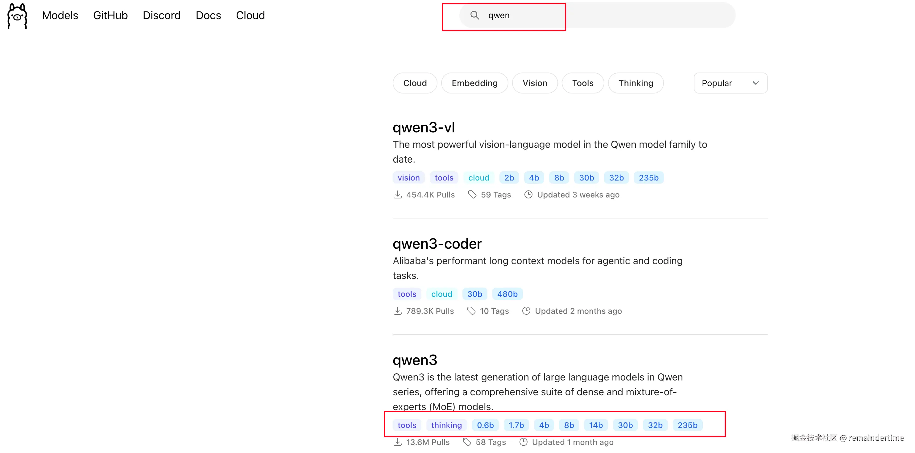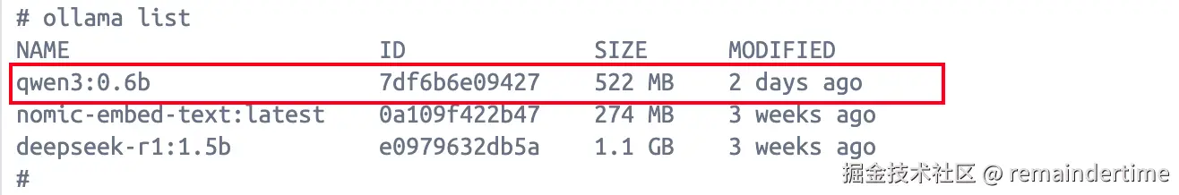 这里选用阿里 Qwen 3:0.6b 模型。"b" 代表 billion(10 亿参数),0.6b 即 6 亿参数,是个轻量级模型。参数数越多模型能力越强,但对资源的要求也越高。0.6b 参数量相对较小,资源占用低,非常适合本地部署学习。