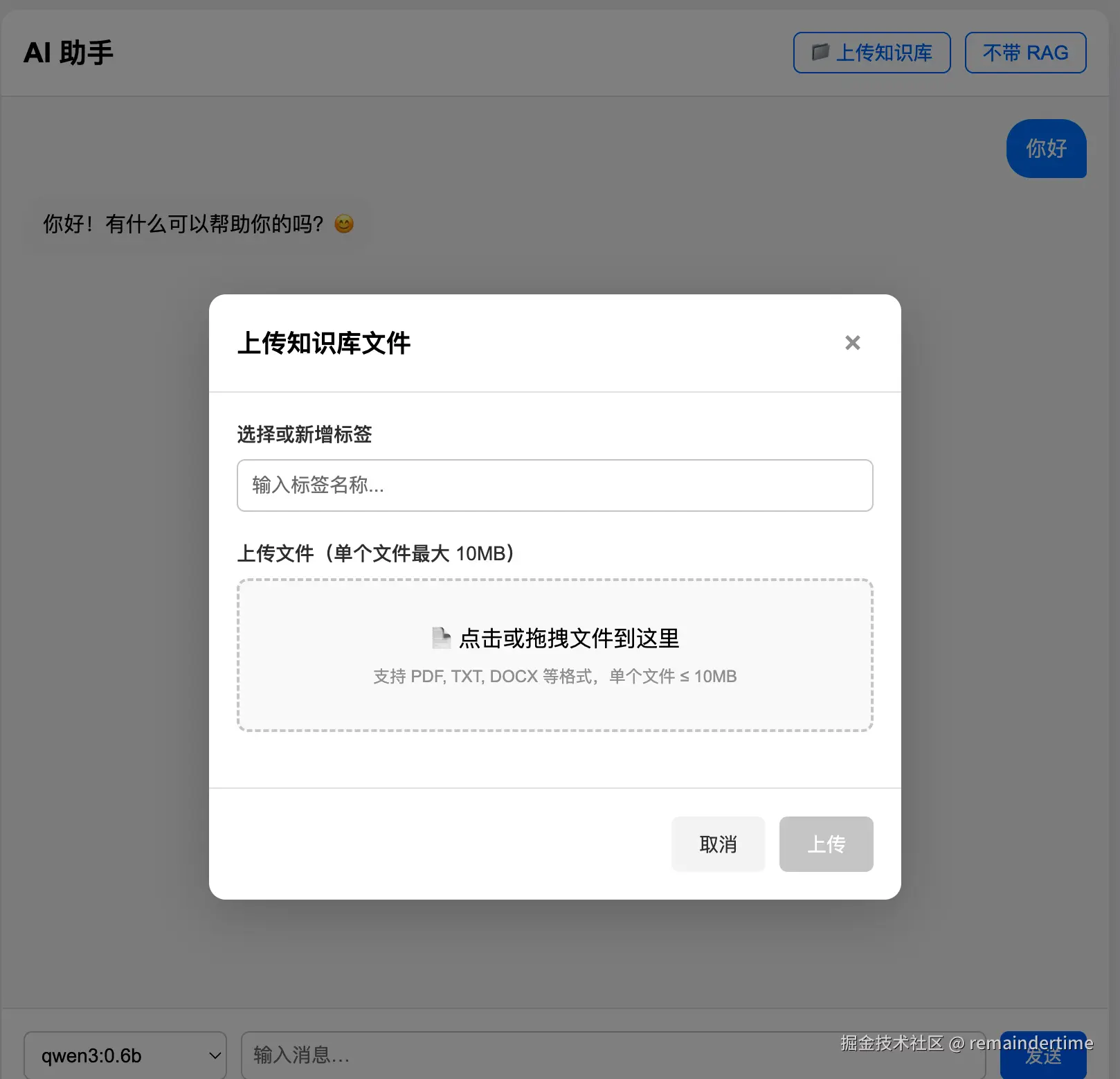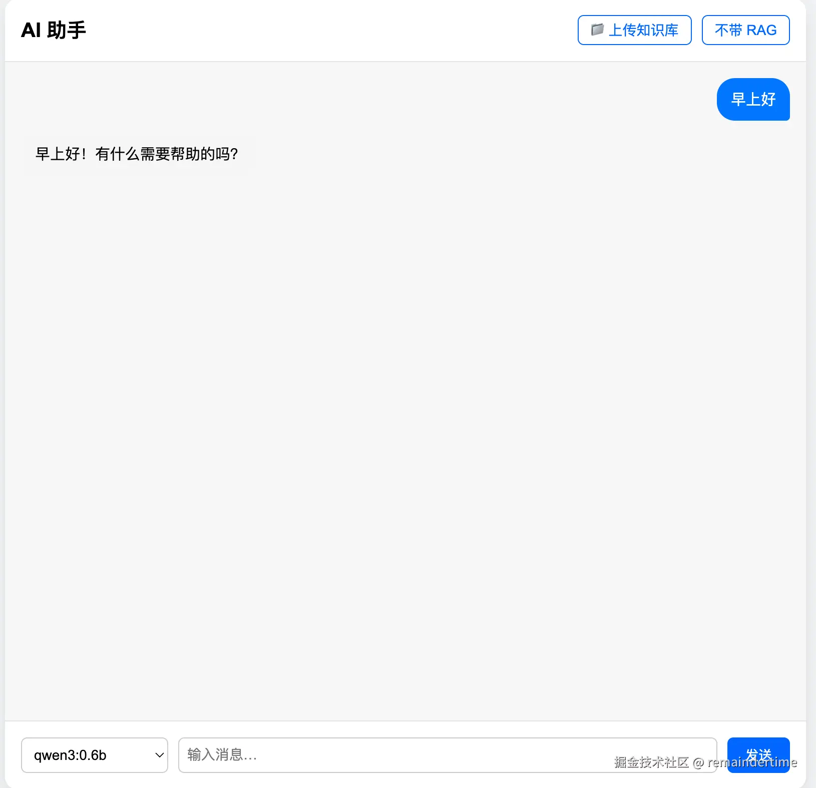 特别注意: 本文同时涵盖了本地大模型对话和 RAG 功能的实现,篇幅较长。如果你只想快速实现本地大模型的基础对话功能,可以直接跳过所有标记为 "支持 RAG" 的内容和章节,这样能大幅缩短阅读和实践时间。