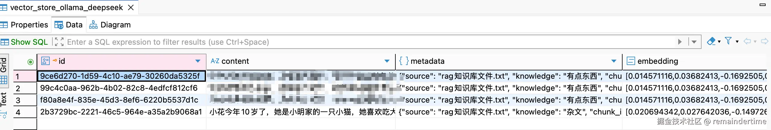 - 检索阶段 — 用户提问时,系统从已有的文档库(就是上面 Pgvevtor 向量库中存储的数据)中检索出最相关的信息