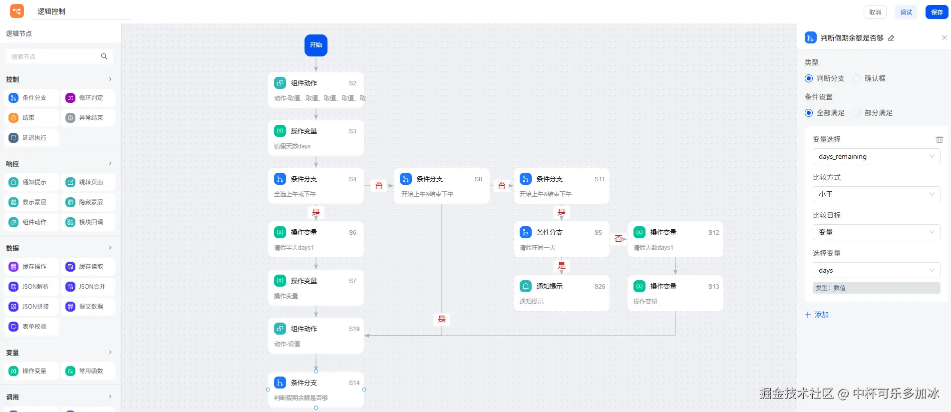 这个场景的核心在于精确计算请假天数,通过条件分支来处理多种时段组合。首先,使用”组件动作“节点,获取申请人填写的请假开始/结束时间、请假类型,以及根据请假类别数据映射带出的剩余假期天数。
