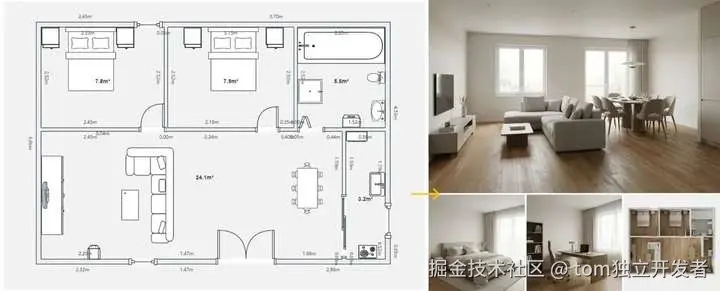 提示词:根据上传的二维平面图,生成一张专业的室内设计展示图。布局:最终图像应为拼贴画,顶部为一张主图,下方为若干张小图。各图内容:1. 主图(顶部):主要起居空间的广角透视图,展示起居室与餐厅之间的连接。2. 小图(左下):主卧室视图,重点展示床和窗户。3. 小图(中下):家庭办公室/书房视图。4. 小图(右下):3D俯视图,展示家具布局。整体风格:所有图像均采用统一的现代简约风格,搭配温暖的橡木地板和米白色墙面。质量:照片级渲染,柔和的自然光。