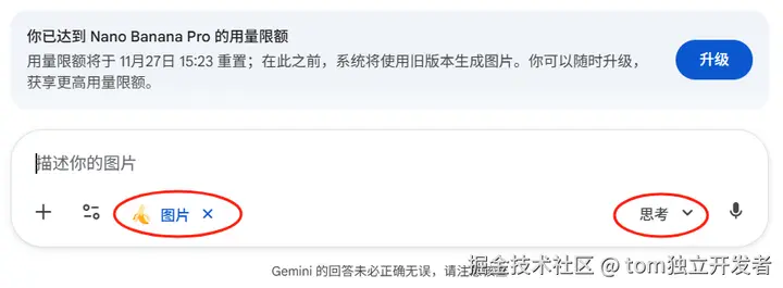 - 免费限制:免费用戶享有一定的体验额度,但有每日生成张数的限制。免费额度用尽后,系统会自动降级到标准版的 Nano Banana 模型。