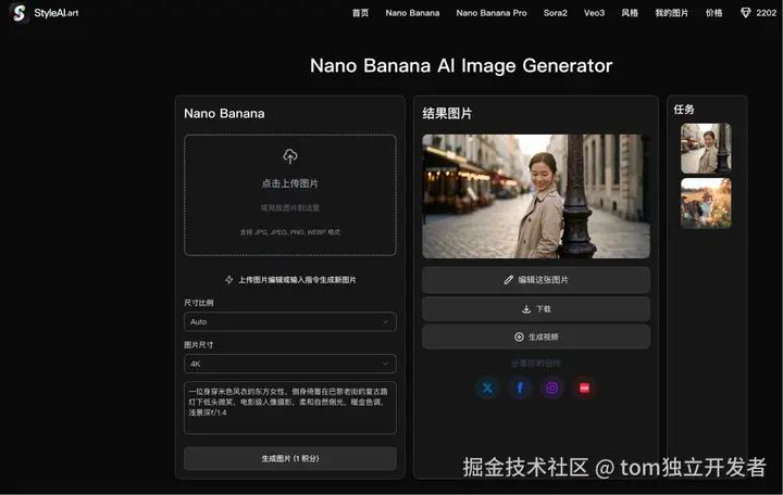 如果你不会科学上网,那你可以通过StyleAI官方网站(styleai.art/zh/nano-banana-pro)体验Nano Banana pro模型,StyleAi是Ai绘画视频工具,内含Nano Banana、Nano Banana Pro、GPT-4o、Sora 2、Veo 3.1、Veo3.0模型。每天免费3次,月90次随便造,国内直连秒出图!