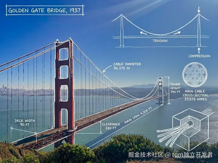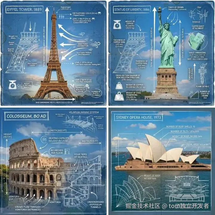 提示词:制作一张[地标]的信息图,将地标的真实照片与蓝图风格的技术注释和图表叠加在图像上。在角落的手绘框中注明标题“[地标]”。添加白色粉笔风格的草图,展示关键结构数据、重要尺寸、材料用量、内部结构图、荷载流向箭头、横截面图、平面图以及显著的建筑或工程特征。风格:蓝图美学,照片上叠加白色线条图,技术/建筑注释风格,具有教育信息图的感觉,注释后方可见真实环境。