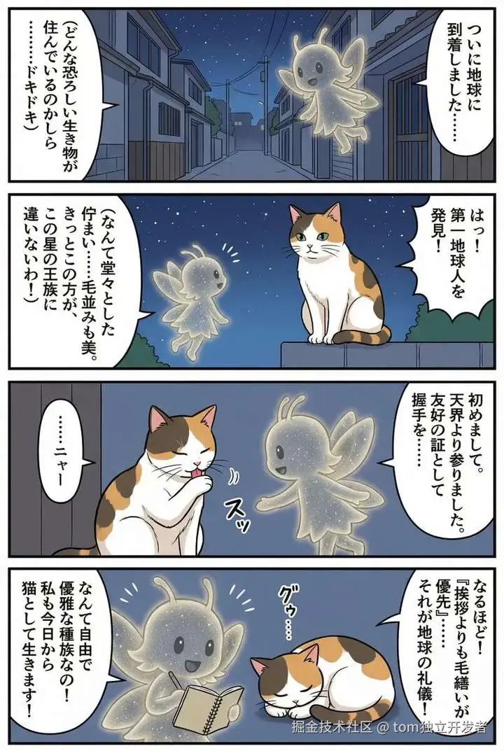 一位仙女从天而降来到地球。她遇到的第一件事物是一只三色猫,于是她认为这个星球是猫的星球,并画了一幅四格漫画,讲述她和猫对话的故事。