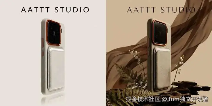 提示词:为这款米色皮革手机壳设计产品海报。手机壳侧立放置的超近景特写,清晰展现素皮细腻纹理与橙色金属镜头圈的撞色质感,背部吸附同色系磁吸卡包。米色背景,周围缭绕棕色透明轻纱,搭配几株蕨类植物、沉香枯木与两支铃兰作为前景点缀。4K超清画面质感。静物摄影,昏暗氛围,光线追踪,高级柔光。海报上方文案标题:"AATTT STUDIO",极细衬线字体。页面下方小字:"素皮 | 磁吸 | 极简"。艺术签角标:"AATTT | Design"。