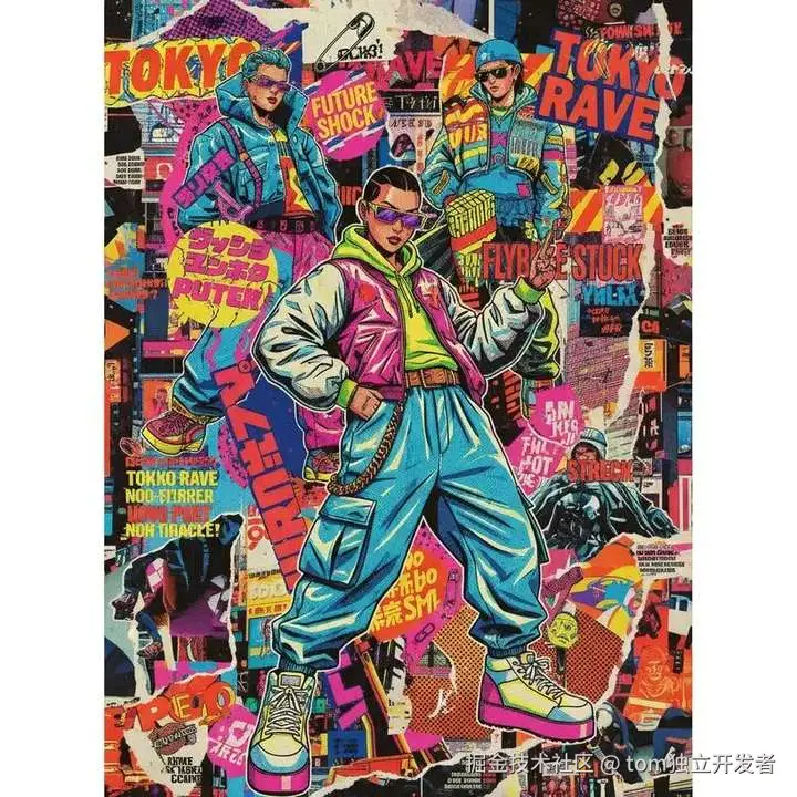 提示词:复古的 Y2K 杂志海报拼贴风格,街头时尚人物,强烈的表情和姿态,覆盖屏幕的日文和英文粗体文字,高饱和度的色彩碰撞,密集的布局,结合了喜剧感和朋克气质,整体氛围具有东京街头文化气息。