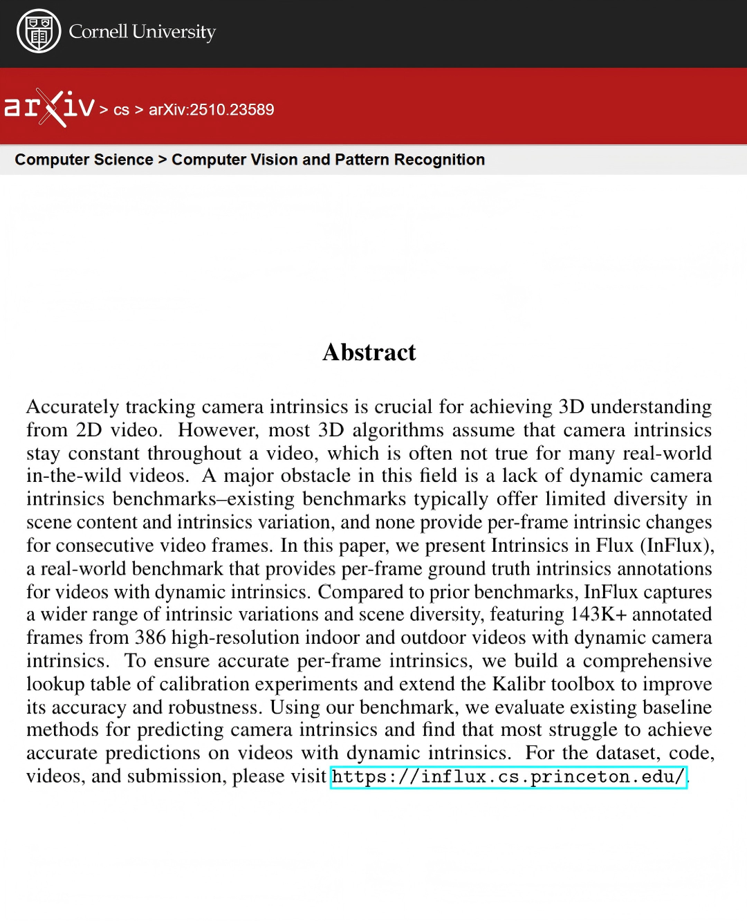 论文标题:InFlux: A Benchmark for Self-Calibration of Dynamic Intrinsics of Video Cameras