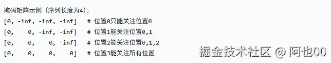 - 这个掩码矩阵在主对角线及其左下角的位置值为 0(表示允许关注)