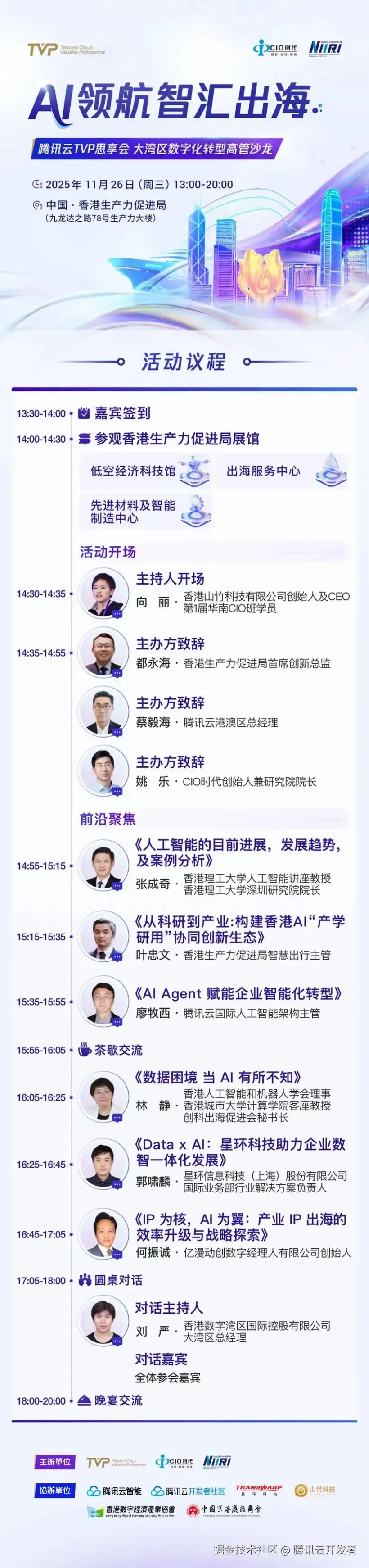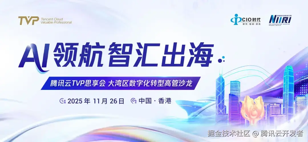 11 月 26 日(周三) ,TVP 首场香港活动即将重磅启幕!本次 「腾讯云 TVP 思享会」 特邀粤港澳大湾区领军企业、携手 AI 领域顶尖专家学者,围绕 “AI 领航 智汇出海” 展开深度对话,共探 AI 赋能企业出海新路径,推动大湾区数字化转型与跨境发展提质增效。